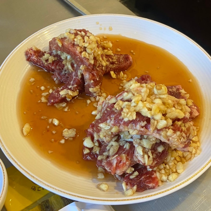 고기를 주문하면 기본 반찬이 나옵니다. 깔끔하고 맛있었습니다. 약간의 생고기도 제공되었습니다. 저는 생고기를 별로 안 좋아해서 친구들만 먹었거든요.
