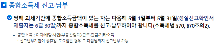 또한 임대 소득과 기타 소득이 있는 사람도 종합소득세 신고를 해야 합니다. 종합소득세 신고 대상 여부를 모르기 때문에 신고를 하지 않아 불이익을 받는 분들이 있습니다.