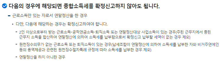 또한 직장에서 연말정산을 하고 다른 소득이 없는 근로소득자는 종합소득세 신고대상에서 제외됩니다.